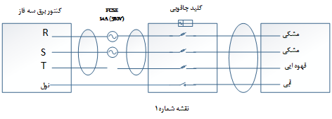 در صورتیکه محل نصب دارای برق 3 فاز باشد با استفاده از نقشه شماره یک و با استفاده از کابل 2.5×5 برای دستگاه کابل کشی کنید و در صورتیکه امکانات برق سه فاز نباشد از برق کنتور تک فاز طبق نقشه شماره 2 و استفاده از کابل 2.5×3 برای دستگاه کابل کشی کنید.